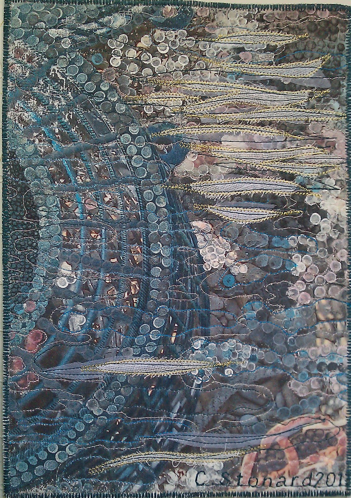 December's JQ is called Button Moon. I have used self dyed fabric, overlaid with sheers, and free motion machine stitching. The tree is knobbly knitting wool couched down with yet more free stitch, and the moon is a clear button, covered with white net and a cream sheer,, held down with silver stitching. I've finished the piece with some clear beads for the appearing stars in a sunset sky.